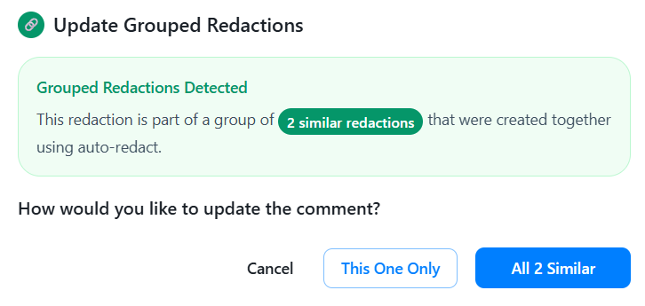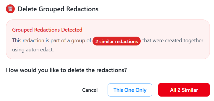 When deleting a redaction, you now get a confirmation dialog asking whether you want to delete just that single redaction or all similar ones in the group. This prevents accidental deletion of related redactions and gives you precise control over your redaction management.