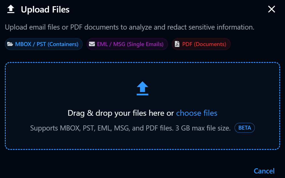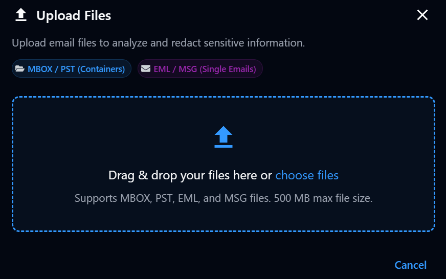 Smart Mode Switching: After uploading files, RedactBox automatically switches to Triage mode so you can immediately review your newly uploaded emails.