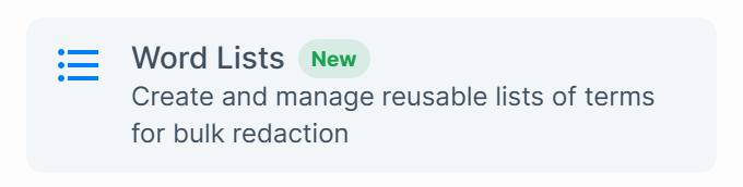 Create reusable lists of terms for bulk search and redaction. Paste comma-separated values or upload a CSV — terms are automatically split and deduplicated. Save lists per project and apply them in Search & Redact with one click.